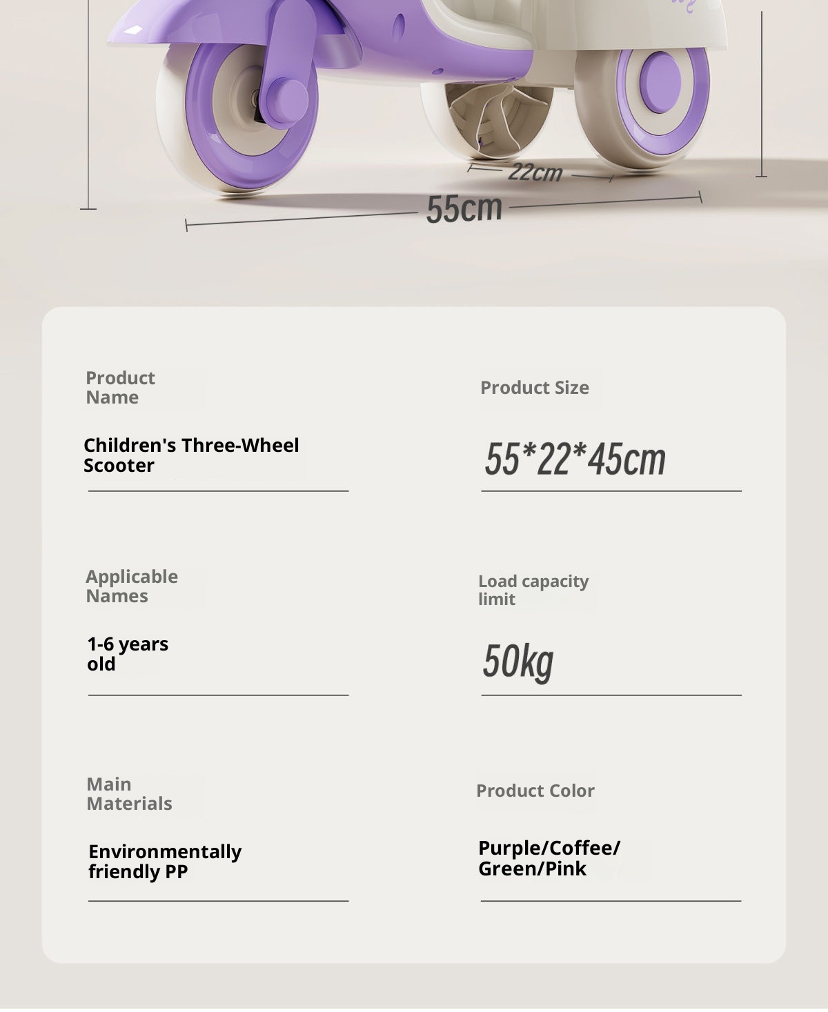Color: purple, coffee, pink, green